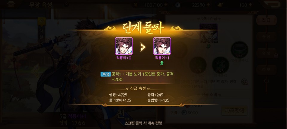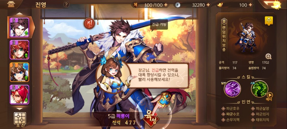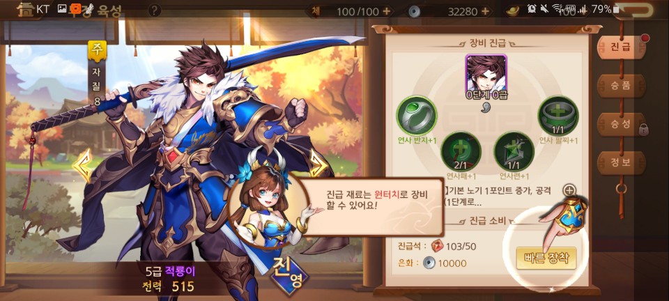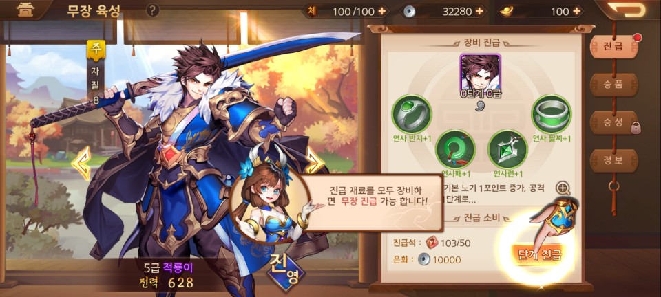 전투의 승리로 얻은 재료로 장수를 진급 시킬수 있습니다. 전투가 끝나면 수시로 진급 및 레벨업을 시켜줍니다.