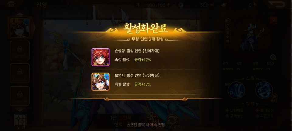 보연사를 진영에 추가 시키면 손상향과의 인연이 활성화됩니다. 앞으로 동료를 편성함에 있어 이 인연을 잘 활용하여