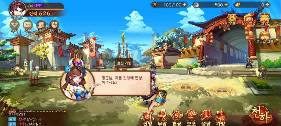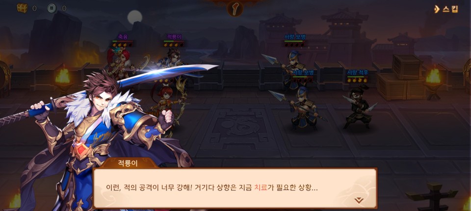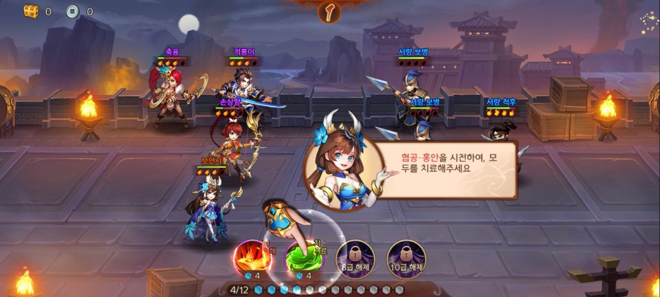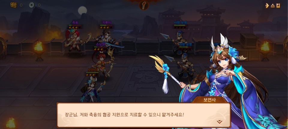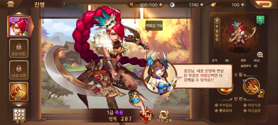1장을 클리어하면 축융을 얻게 됩니다. 진영에 포함시키고 레벨을 올려줍니다.