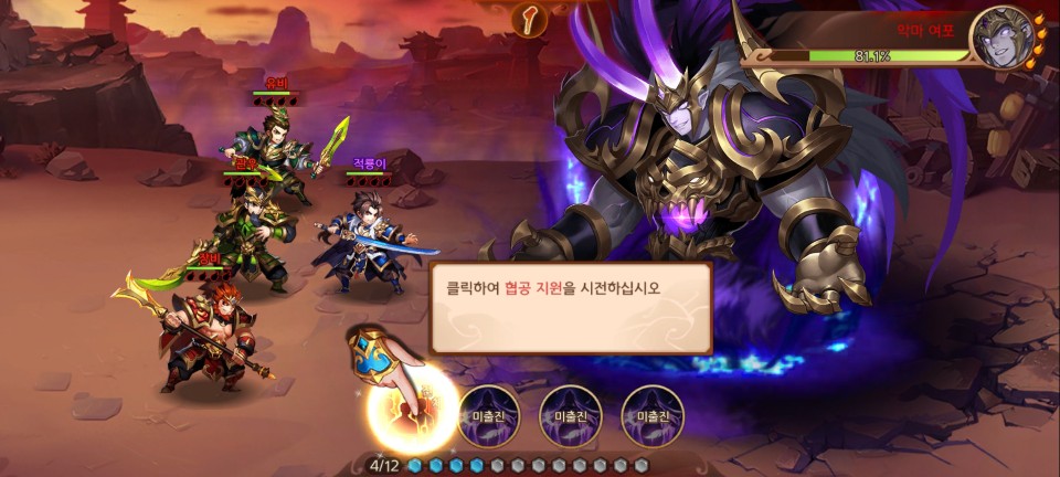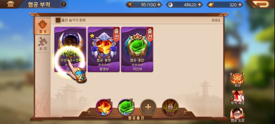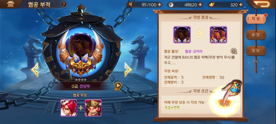 다시 전투를 진행하다 보면 새로운 무장과 협공 부적을 얻게 됩니다. 협공 부적은 새로운 협공 스킬을 활성화시켜