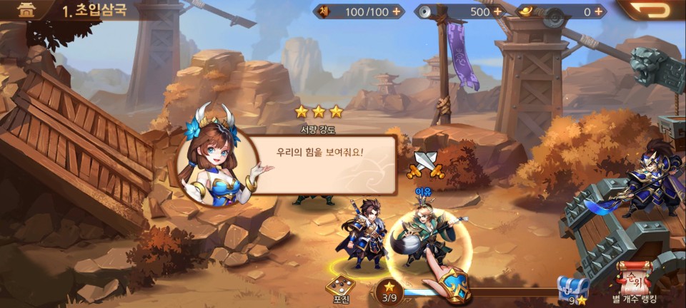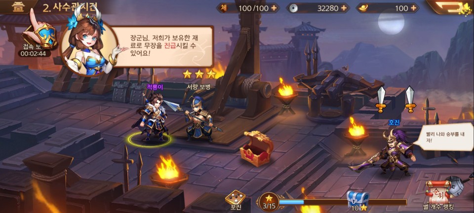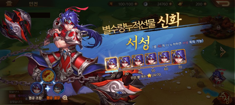 이제 주성에서의 활동이 가능해집니다. 그리고 스토리를 클리어하며 얻은 별 수량에 따라 신화 무장 서성의 조각을