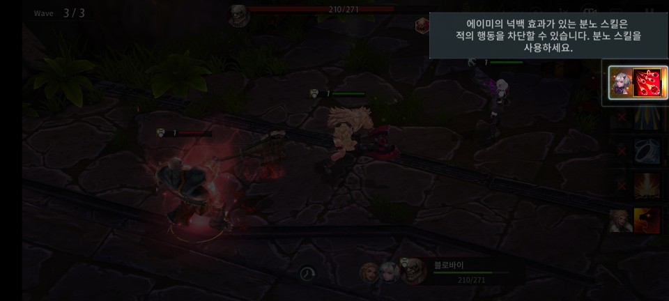 에이미의 넉백 효과가 있는 분노 스킬은 아군을 공격하려는 적의 행동을 차단해줍니다.