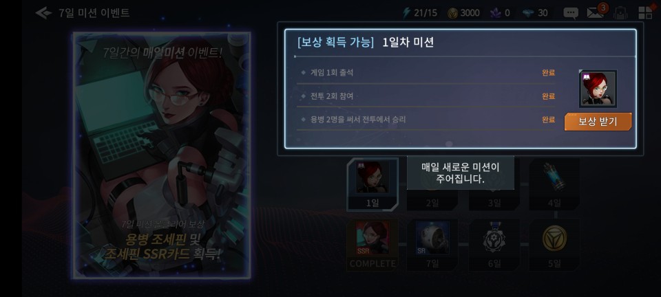 1일 차 보상으로 SSR급 용병 조세핀을 획득합니다. 7일 동안 미션을 수행하면 많은 보상을 얻을 수 있습니다.