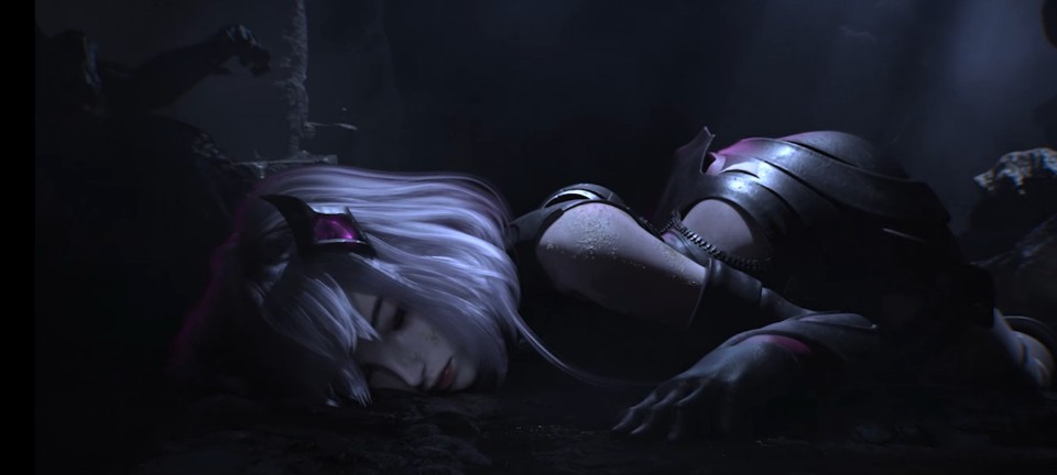 용병단과 힘을 합쳐 싸운 에이미가 쓰러지고 멋진 동영상이 재생됩니다.