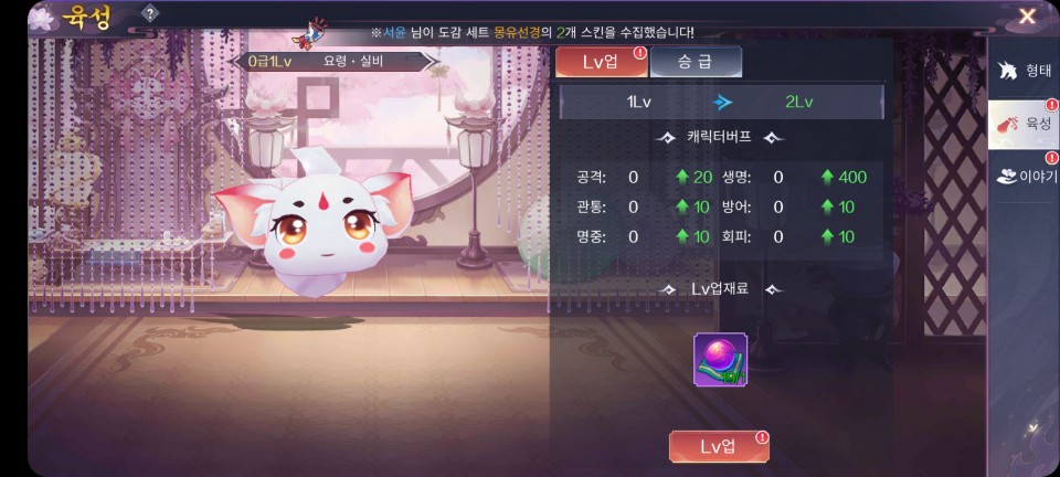 실비의 활성화 진도를 전부 진행해주면 외모가 바뀌면서 능력치가 올라갑니다. 아직까지는 귀여운 모습입니다.