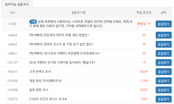 쉽게 참여할 수 있습니다. 그 외에도 기업들이 올린 포인트가 큰 설문도 물론 존재합니다.