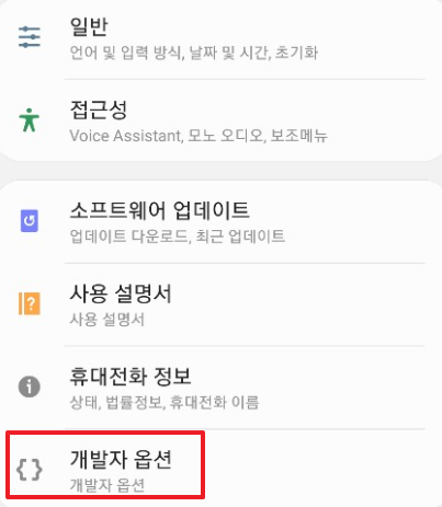 해제 후 설정화면으로 돌아가면 '개발자 옵션'이 표시되어 있습니다.