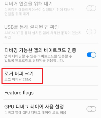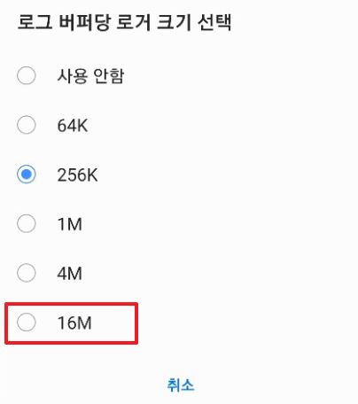 6. 중간에 '로거 버퍼 크기'라는 옵션이 있습니다. '로거 버퍼 크기'를 터치합니다.