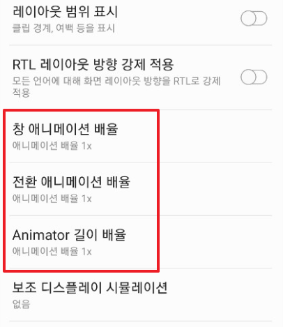 간단하게 정리하면, 개발자 옵션에서 로거 버퍼 크기를 256K에서 16M로 변경, 애니매이션 배율 3가지 옵션을 1x에서 0.5x로 변경하는 것으로 속도를 빠르게 할수 있습니다.