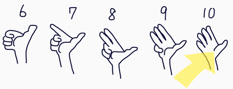 ▶ 6부터 10까지는 반대로 손바닥을 내쪽으로 향하여 아래와 같이 손가락을 접습니다.