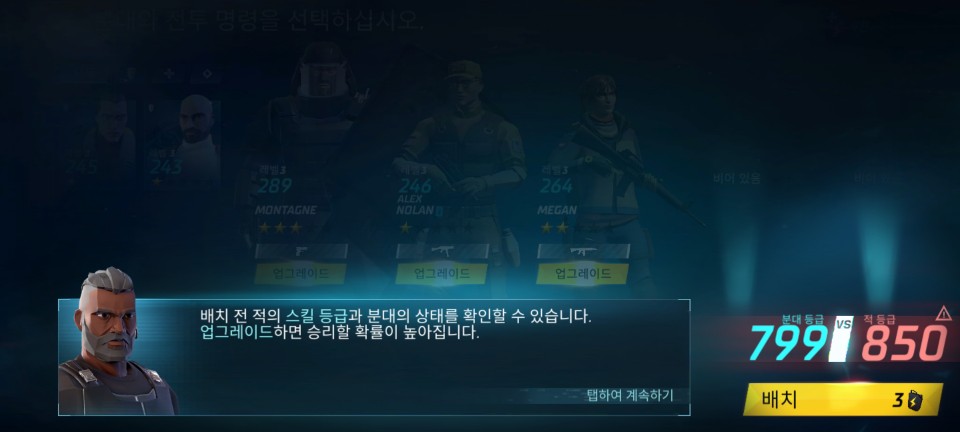 전투력이 표시 됩니다. 승리하지 못할 가능성이 높으므로 아군의 업그레이드나 추가 병사 투입 등으로 전투력을
