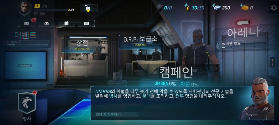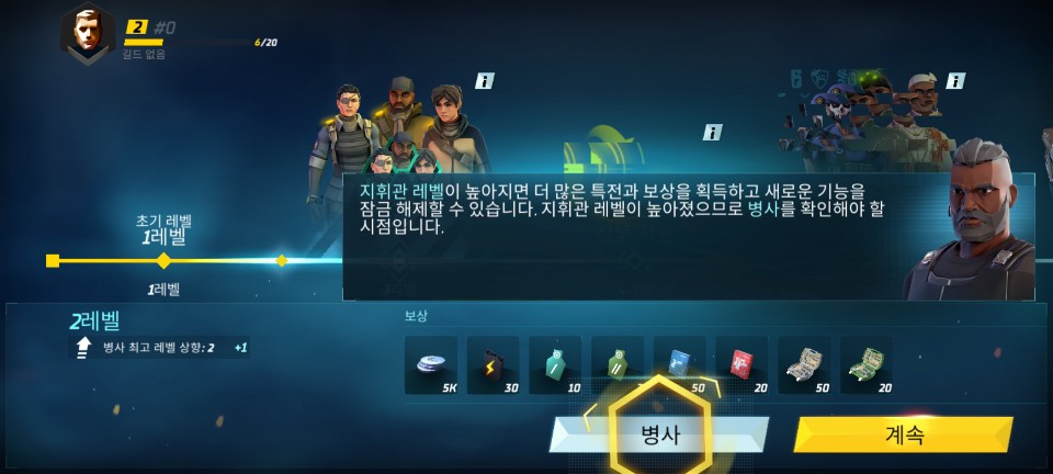 부족할 때 열심히 임무를 수행해서 레벨을 올리도록 합시다. 여기까지 오면 튜토리얼이 끝나고 메인 화면에서