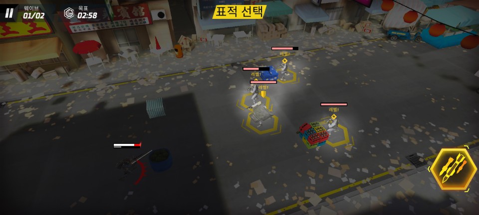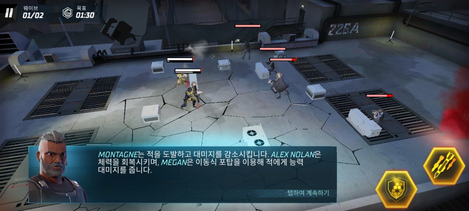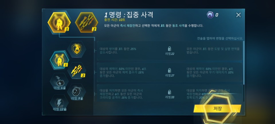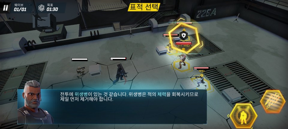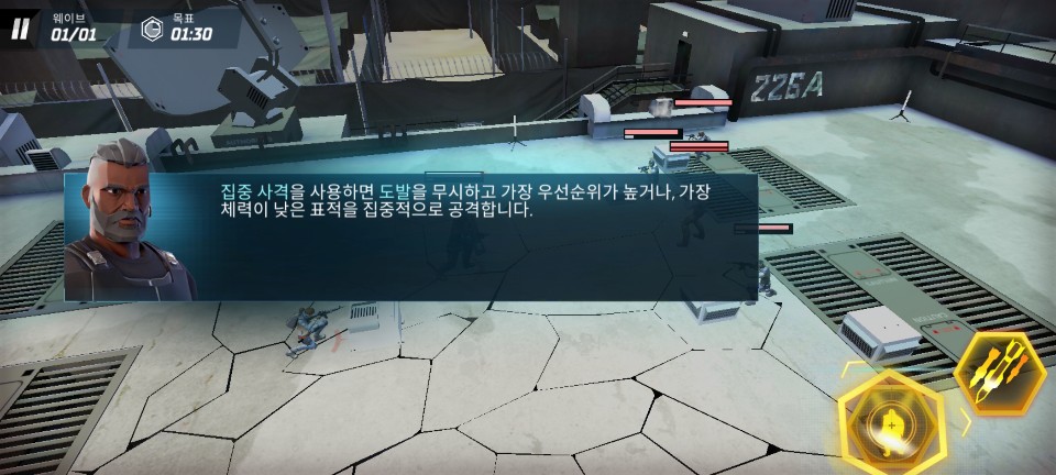 전투 준비 중 스킬을 변경 할 수도 있습니다. 집중 사격은 가장 위협적이거나 체력이 낮아서 한 번에 제거할 수 있는