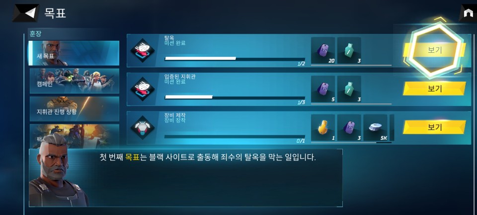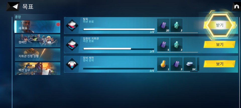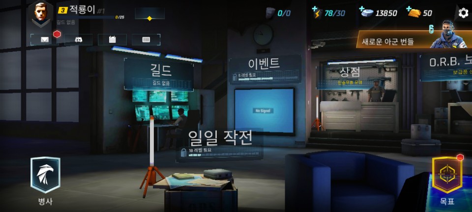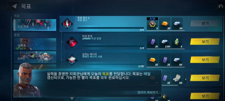 지휘관 레벨 3에 도달하면 길드 게임 모드 잠금이 해제됩니다. 일일 목표도 제시해 주므로 초반에 아이템 등이