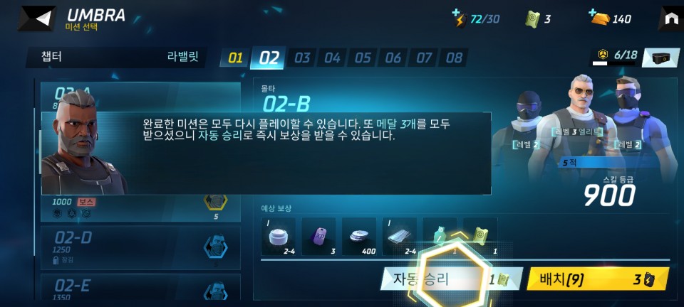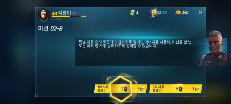 한 번 이긴 전투에서는 메달 3개로 클리어했을 경우 자동 승리로 다시 즉시 보상을 얻을 수 있습니다.