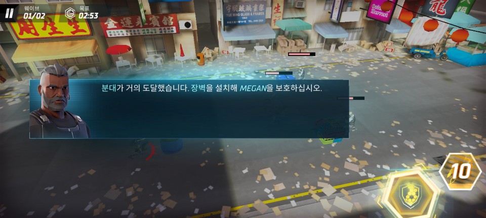 다른 스킬은 장벽을 설치하여 가드를 해주는 방어 스킬입니다. 홀로 싸우고 있는 MEGAN에게 방어 스킬을 사용합니다.