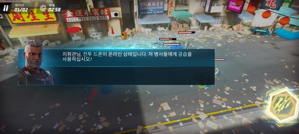우선 활성화 되어 있는 스킬인 드론 공격을 해봅니다. 표적을 선택하면 해당 표적 주위에 광범위 폭격을 합니다.