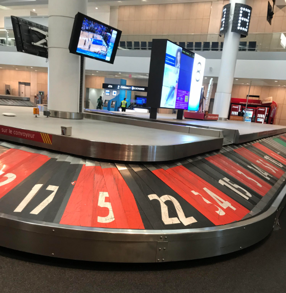 세르비아의 수도 베오그라드 공항의 수하물 수취소. 자동차 트렁크에서 수하물이 나오는 디자인인데 차종은 피아트라고 합니다.