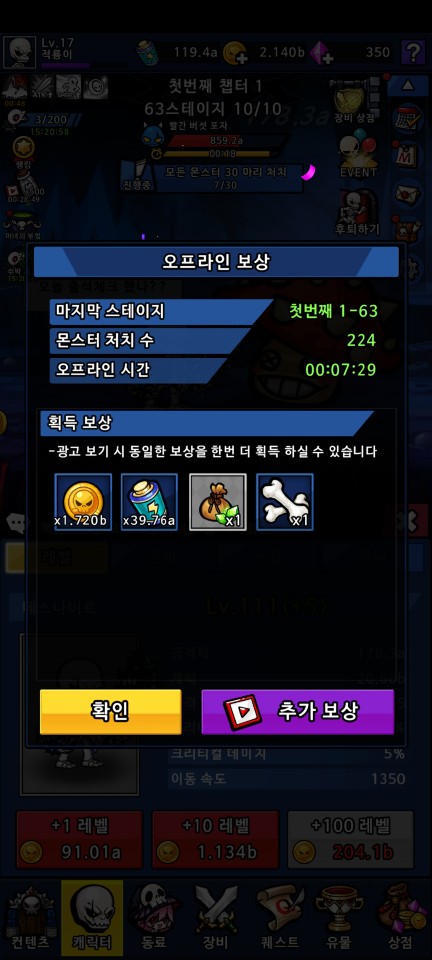 중간에 해골 새가 선물을 들고 날아다니는데 터치해서 보상을 받도록 합시다. 광고를 보면 추가 보상을 얻을 수