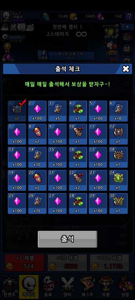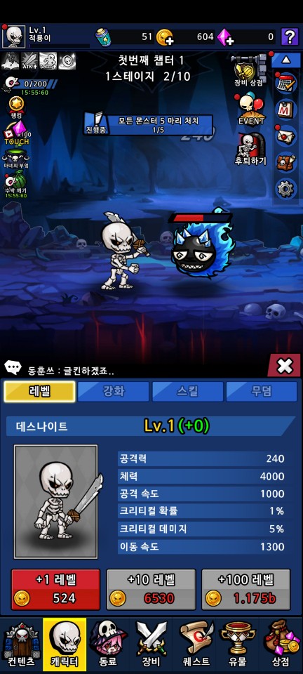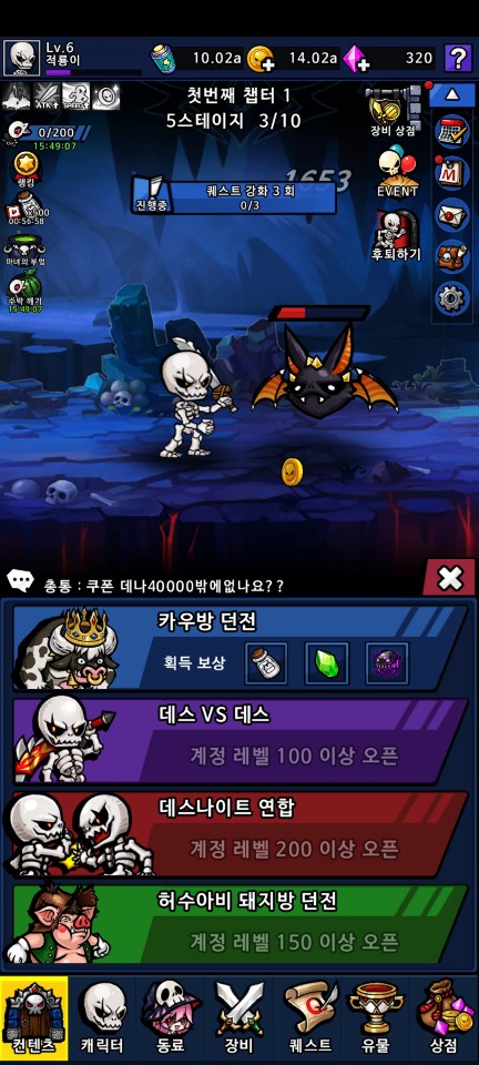퀘스트 강화, 무기 뽑기 등의 퀘스트를 진행해 가면서 데스나이트와 계정의 레벨을 키워 나갑시다.