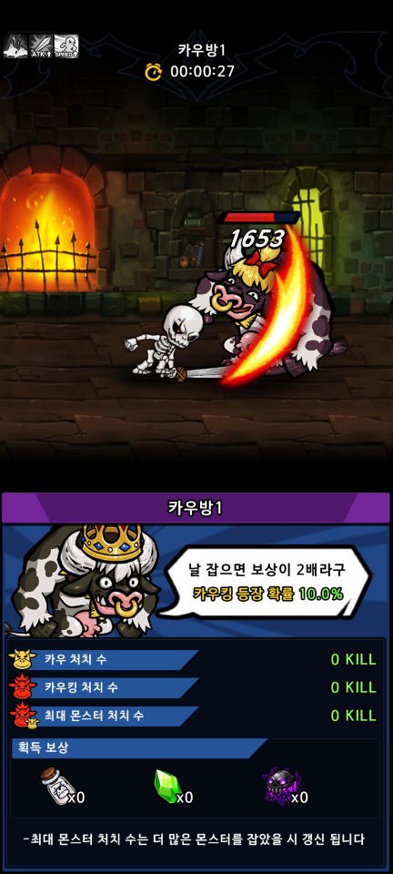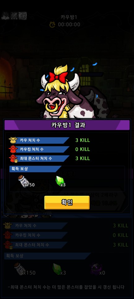 30초 사이에 최대한 많은 수의 카우를 처치해야 하는 이벤트인데 또 어딘가에서 얻은 S급 무기를 장착하고 강화 후