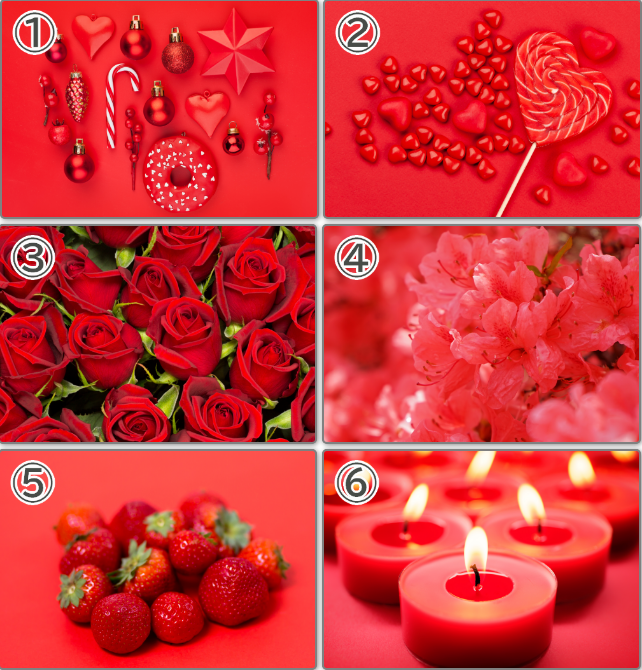이것이 있기 때문에 나는 힘을 낼 수 있어! 하는 것들 한 가지씩 있을 것입니다. 아래에 6가지의 빨간색 사진들이 장식되어 있습니다. 좋아하는 사진을 한 장 골라보세요. 당신의 에너지원을 알 수 있는 심리테스트입니다.