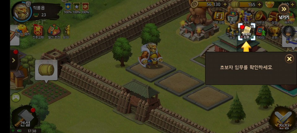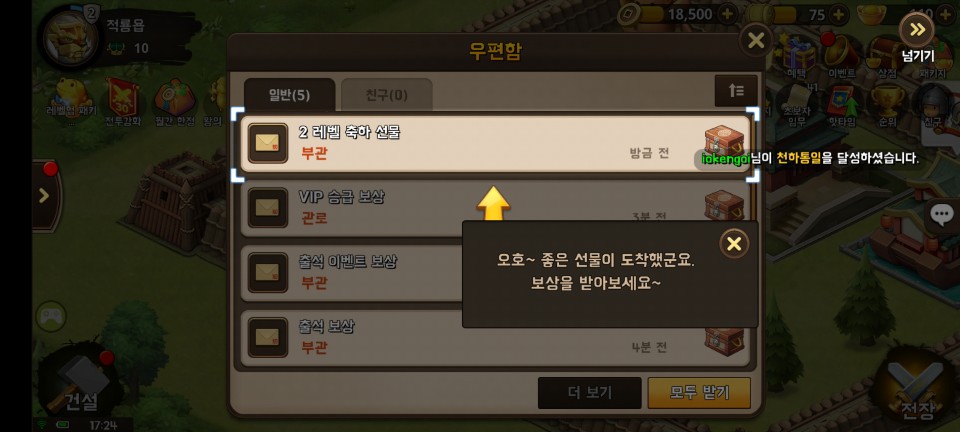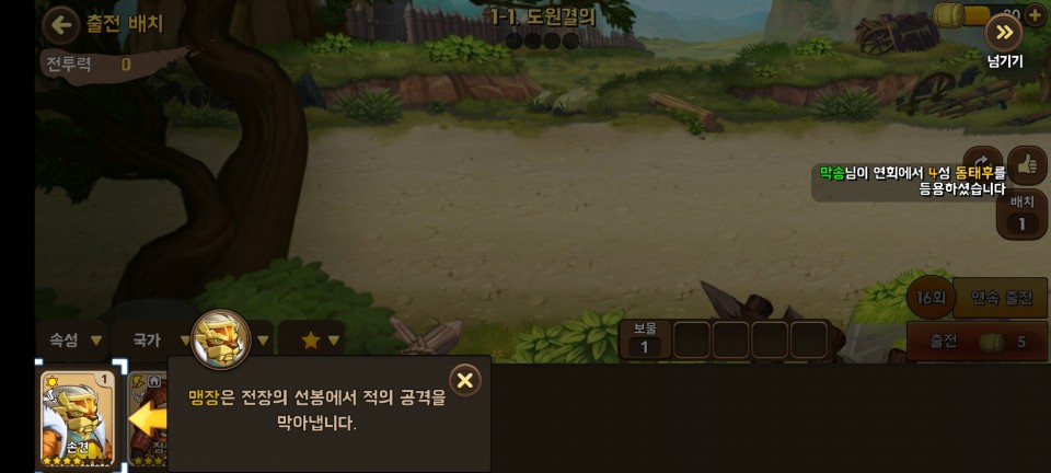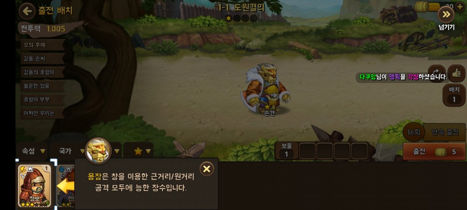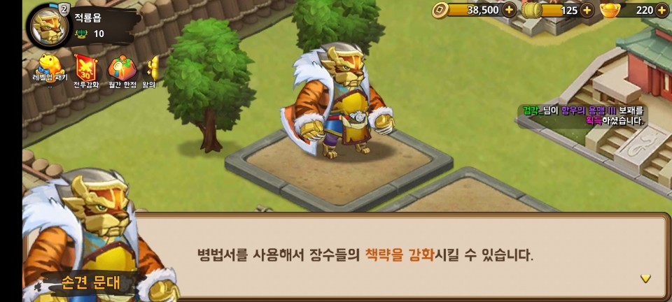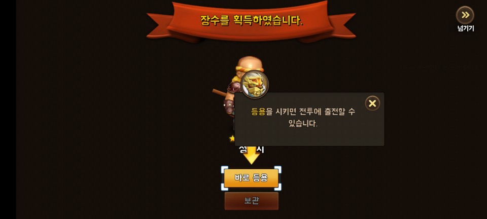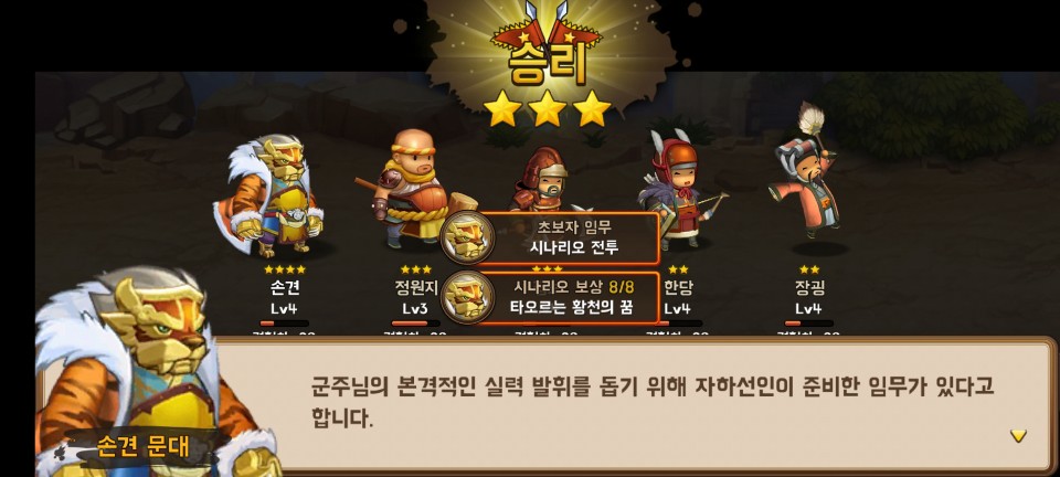 어렵지 않은 첫 전투에서 승리하면 장수 획득과 레벨업 보상을 받습니다.