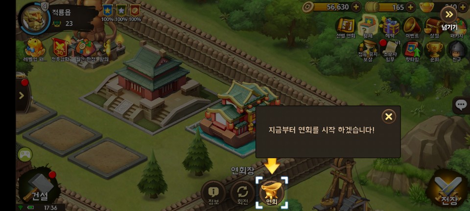 보상들이 있으니 함께 진행하도록 합시다. 이제 연회라는 메뉴도 해제됩니다. 연회는 쉽게 말해 장수 뽑기입니다.