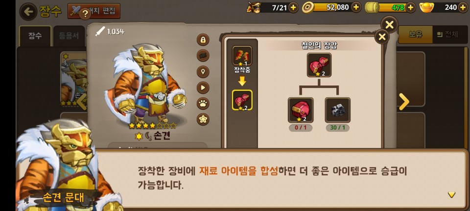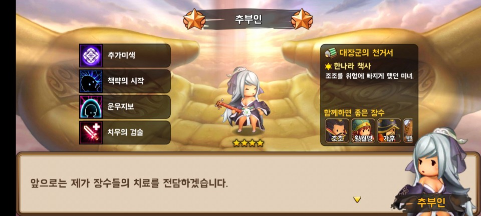 회복을 주특기로 하는 좋은 캐릭터입니다. 새로이 얻은 장수는 장수 전수라는 시스템으로 레벨을 올려줍니다.