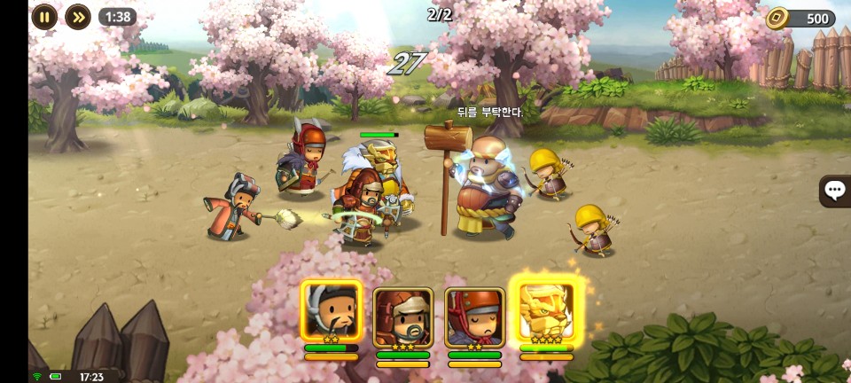 이제 킹덤스토리의 꽃 전투에 들어가 보도록 하겠습니다. 각 장수에게는 특성이 있습니다. 공격, 방어, 회복, 지원 등