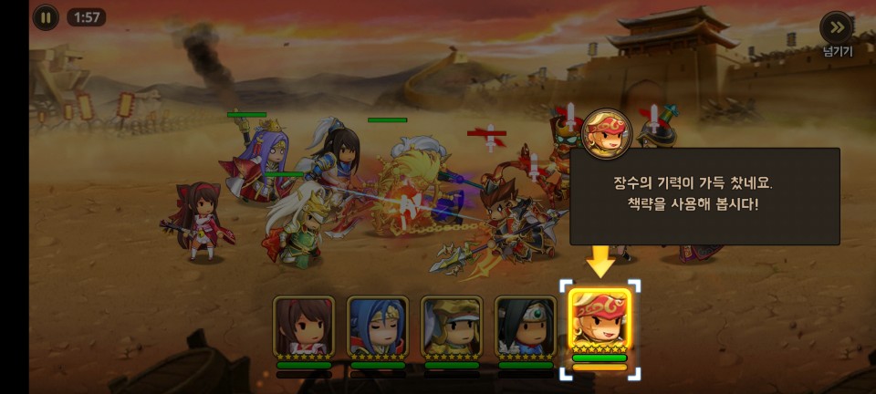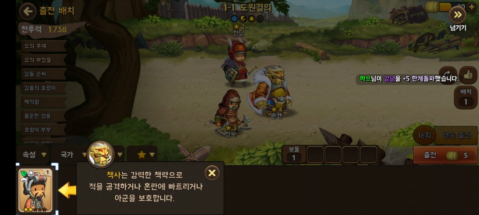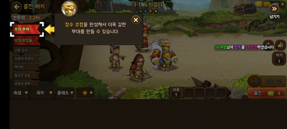장수 조합으로 팀을 더욱 강력하게 할 수도 있습니다. 조건에 맞는 장수들로 구성하면 장수 조합이 발동됩니다.