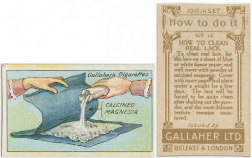흰색 또는 파란색 종이 수건을 깔고 레이스를 올린 뒤 마그네슘 가루를 그 위에 넉넉히 뿌립니다. 그 위를 다른 종이 수건으로 덮고 무거운 물건을 올려 며칠간 눌러둔 뒤 가루를 털어내면 레이스가 새것처럼 깔끔해집니다.