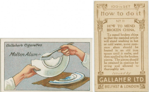 깨진 그릇은 백반을 가열해 녹인 뒤 접착제처럼 써서 붙이면 붙습니다. 이후 붙을 때까지 끈으로 고정해 둡니다. 도자기 접착제가 시중에 많이 나와 있어서 실용성이 떨어질 수도 있으나, 그래도 알아두면 쓸 만한 생활의 지혜입니다.
