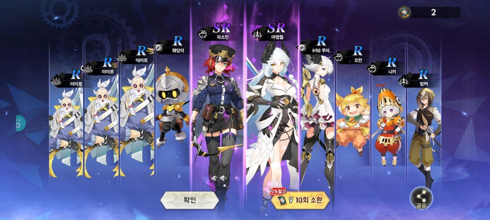 추가로 다시 한번 10회 소환을 해보았는데 SSR급은 나오지 않았습니다. 하지만 20회 소환 안에 SSR급이
