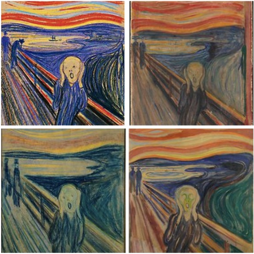 '절규'는 4부작입니다. 같은 테마로, 1893년에 유화 버전과 크레용 버전을, 1895년에는 파스텔 버전, 1910년에는 템페라(물감의 일종)로 그렸습니다.