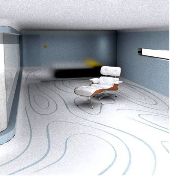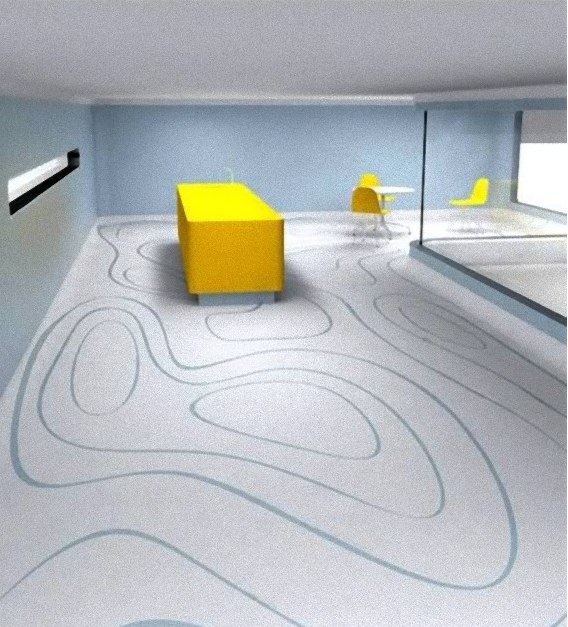 바닥에 그려져 있는 무늬는, 인간의 동선을 기준으로 하고 있습니다. 가구등의 장애물을 고려한 디자인으로, 이 방을 사용하는 사람이 어떤 식으로 움직이는지를 우선 촬영한 후, 그 동선을 CG 처리해서 바닥에 프린트했다고 합니다.