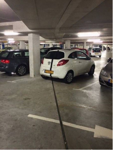 하얀색 차의 검은색 라인과 바닥의 홈이 일치해서 이어지는 듯 보입니다.
