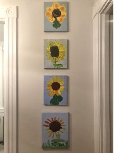 4명의 자녀를 둔 집의, 각각 5살 때 그린 해바라기 그림