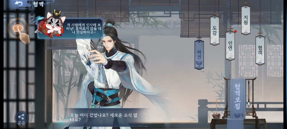 또한 게임이 진행되면서 여러 협객과 사귀게 되는데 협객 메뉴에서 인연을 활성화 하고 협객들의 호감도를
