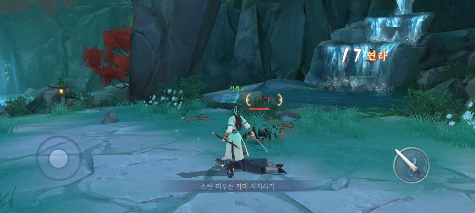 왼쪽 하단 가상 스틱으로 이동, 오른쪽 하단 검 모양으로 공격을 하게 됩니다.