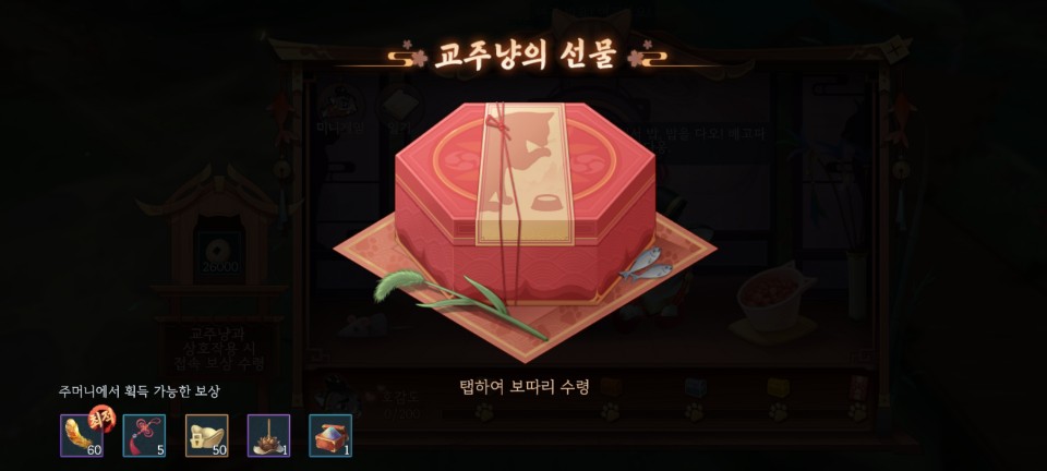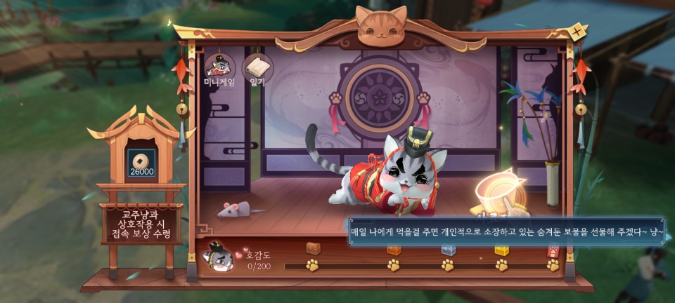약간 뜬금없긴 한데 동방불패 모바일에는 집사 시스템이 있습니다. 알람이 뜨면 저 고양이에게 먹을것을 주어