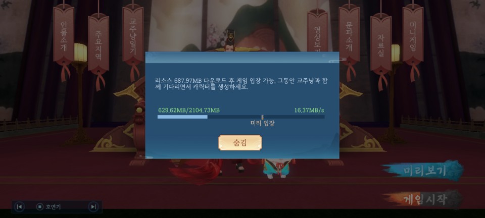 게임을 시작하면 엄청난 완성도의 동방불패 모바일의 오프닝이 전개되고 추가 다운로드가 진행됩니다.