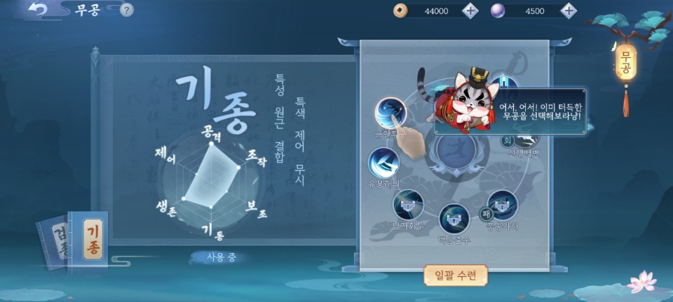 임무를 수행하다 보면 새로운 무공도 익히게 되는데 빨간색 알림이 뜨면 무공을 수련하여 무공 레벨을 올립니다.