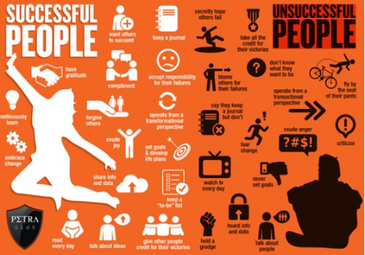 실제로 성공한 기업가인 '페트라 코치'의 CEO인 앤디 베일리가 성공하는 사람과 실패하는 사람의 16가지 차이를 단적으로 나타낸 인포그래픽을 만들어 냈습니다. 거기에는 일러스트로 알기 쉽게 그 차이를 정리하고 있습니다.