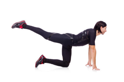 ○ 한쪽 다리를 뒤로 쭉 뻗은 채 엉덩이와 같은 높이가 되도록 들어 올립니다.