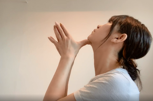 ① 발을 엉덩이 넓이만큼 벌리고 똑바로 선 다음, 손가락 힘으로 턱을 밀어 올립니다.