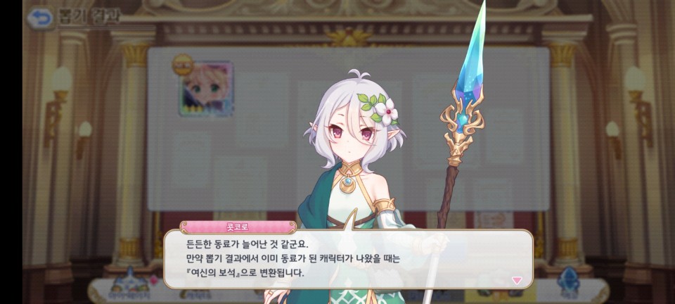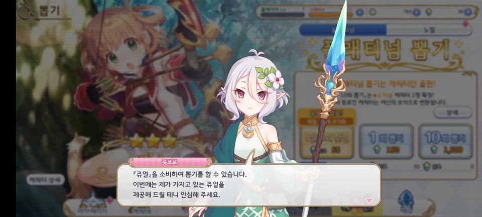 여기까지 진행되면 무료로 뽑기 한번을 진행할 수 있습니다. 뽑기에는 쥬얼이 필요한데 처음에는 콧코로가