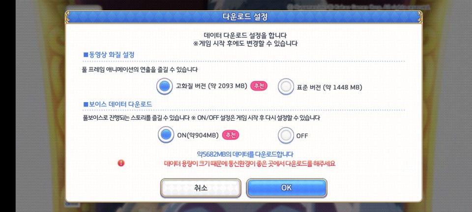 프린세스 커넥트 Re:Dive는 고화질 버전에 보이스 데이터까지 추가로 다운로드를 하면 거의 6GB에 가까운
