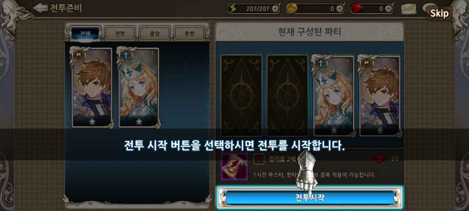 첫 전투에 로이와 클레오도 참가를 하게 됩니다. 여기까지의 등장인물들은 모두 1성으로 시작을 합니다.