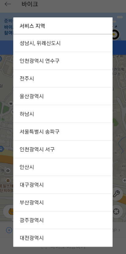 카카오 바이크는 사용지역이 한정되어 있지만, 서울 이외의 지역에서도 사용 가능합니다. 서울이라면 송파구에만 사용할 수 있고, 울산, 대구, 대전, 부산 등의 웬만한 광역시에도 사용할 수 있습니다.